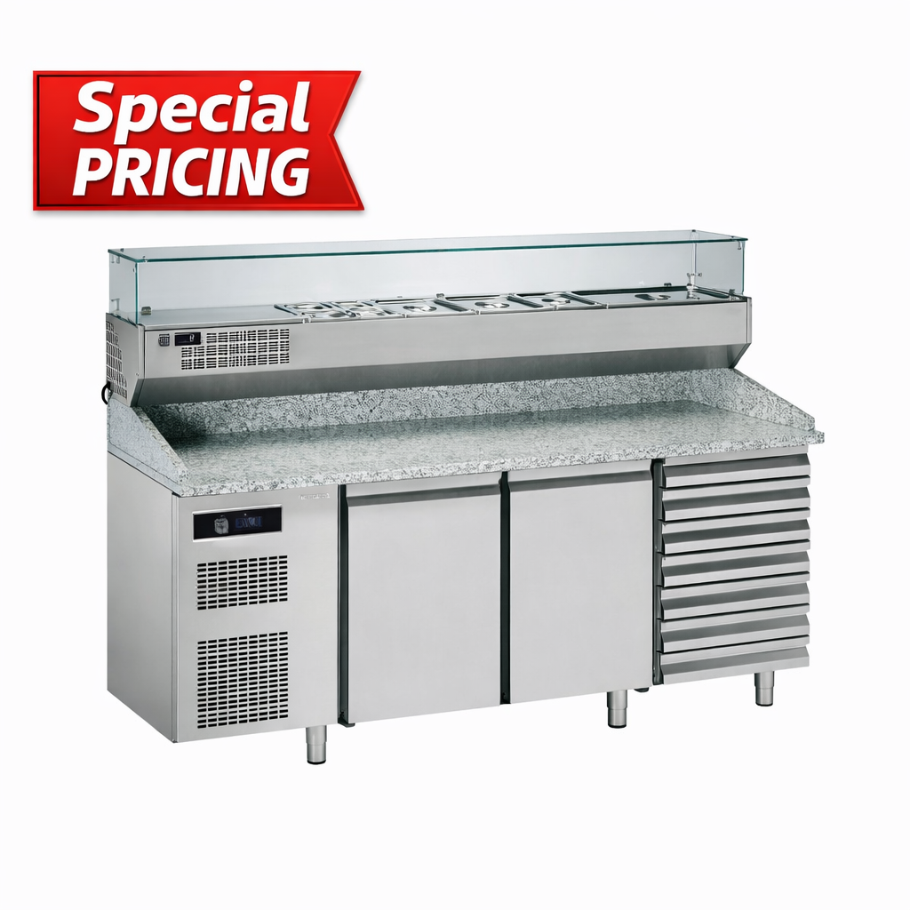 Specially designed refrigerated counter ideal for pizza preparation, allowing easy access to ingredients during service. -